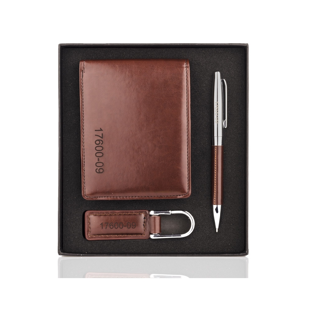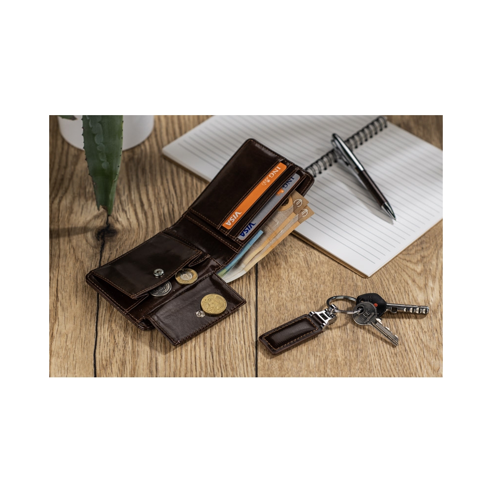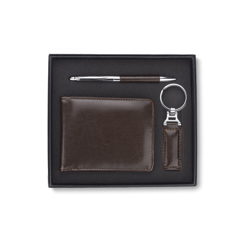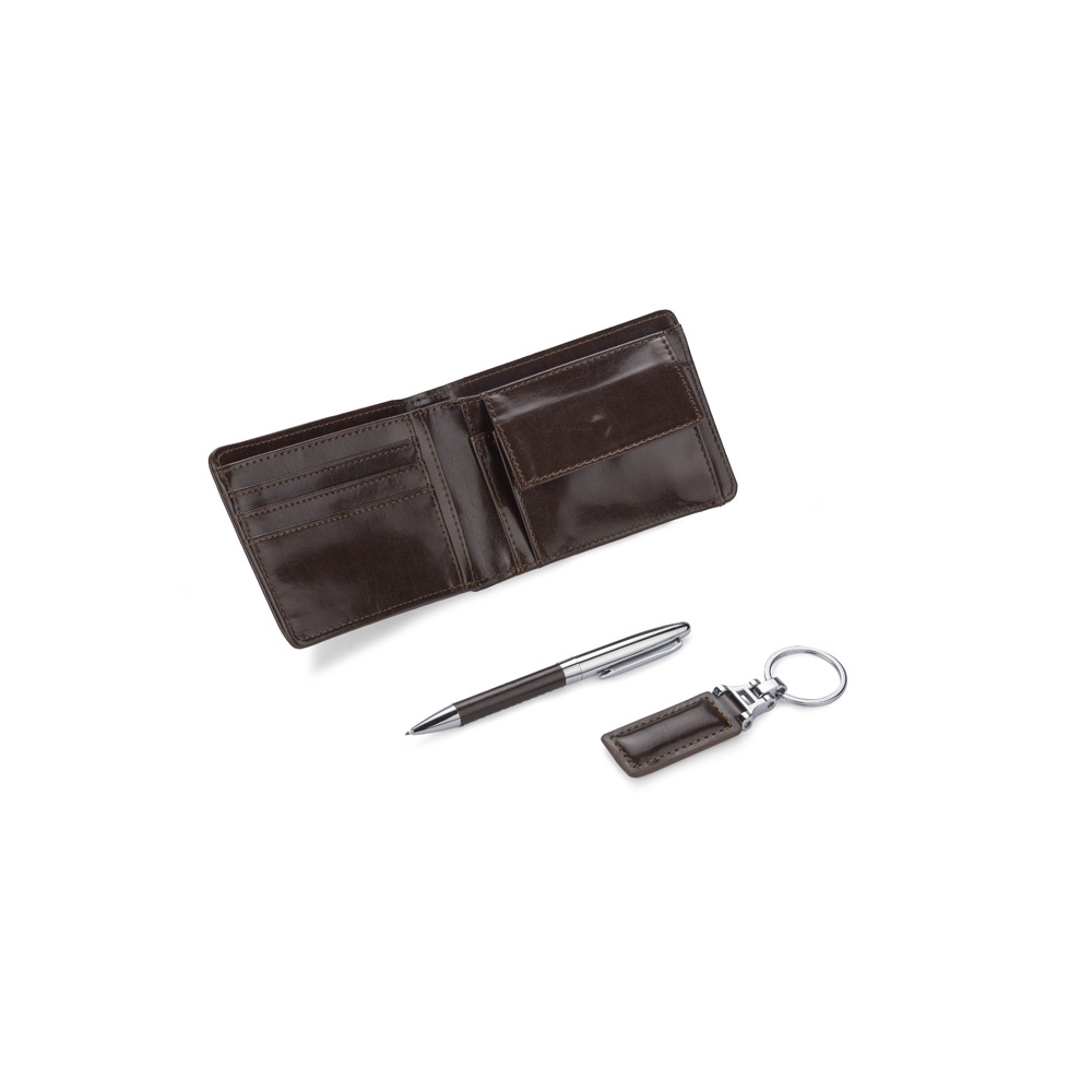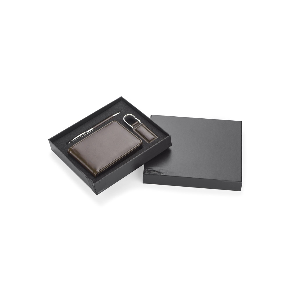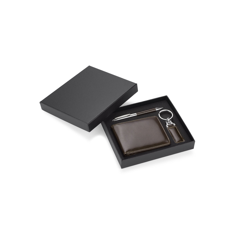 Das Geschenkset besteht aus einem Geldbeutel, einem Schlüsselanhänger und einem Metallkugelschreiber. Der Geldbeutel ist aus Öko-Leder gefertigt und enthält 2 Geldscheinfächer, ein Fach für Münzen und zusätzliche Fächer für z. B. Kreditkarten oder Quittungen. Alle Elemente sind in einer stilvollen schwarzen Schachtel verpackt. Wir können ein Logo auf jedes einzelne Element sowie auf die Box gravieren. Produktabmessungen: 115 x 91 x 15 mm (Geldbörse), 133 x ⌀10 mm (Stift), 65 x 25 x 5 mm (Schlüsselanhänger), 181 x 163 x 31 mm (Verpackung).