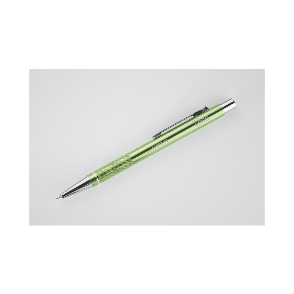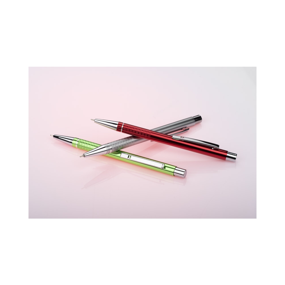 Der Kugelschreiber BONITO ist ein eleganter Metallkugelschreiber in Metallfarben mit Chromverzierung. Der Kugelschreiberkörper aus hochwertigem Aluminium ist mit einem silbernen Ring und Streifen mit einer leicht rauen Textur verziert. Der Stift ist mit einer schwarzen 0,7mm Halbgelmine ausgestattet.