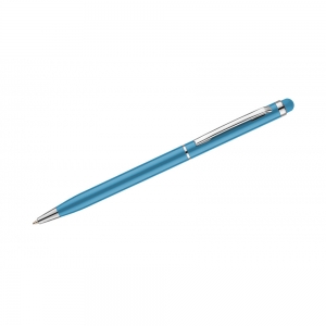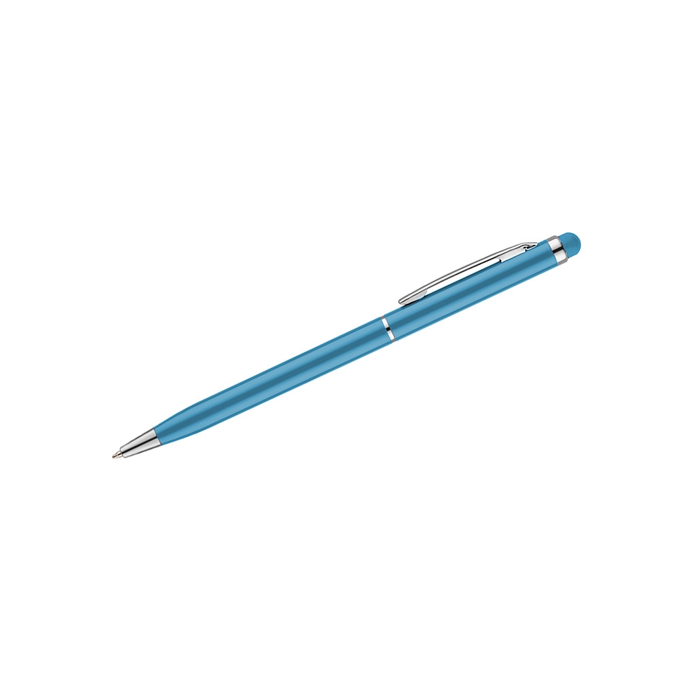 Blauschreibender Metallkugelschreiber mit gummiertem Pointer zum Bedienen von Touchscreens (wie iPhone / iPad), hochglänzenden Akzenten und Dreh-Klicksystem.