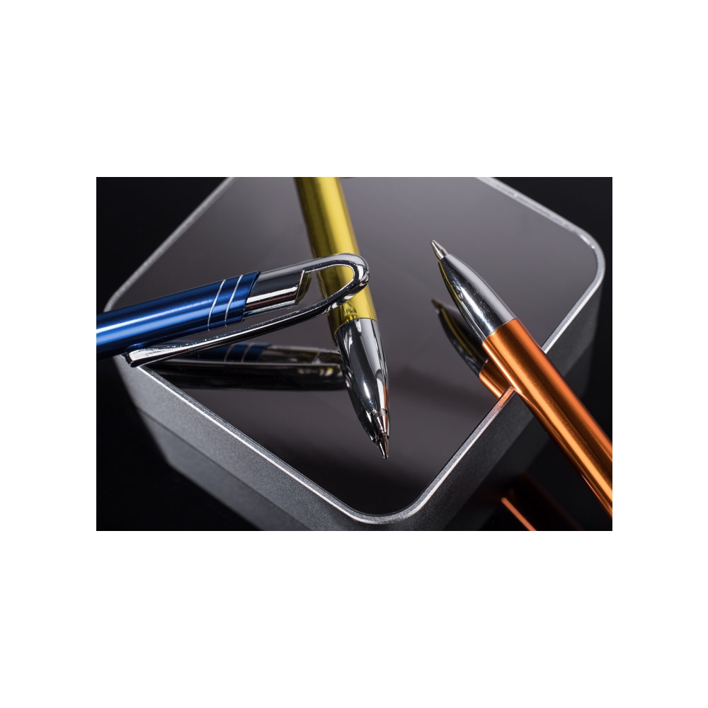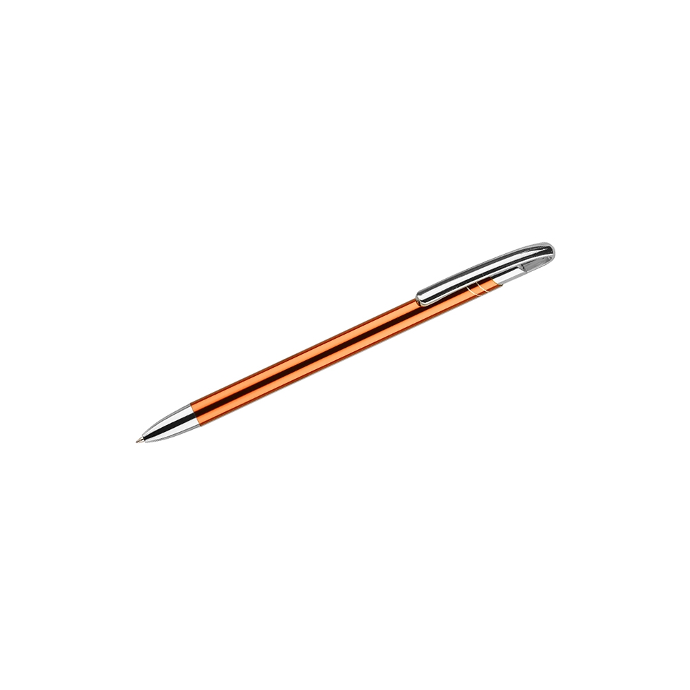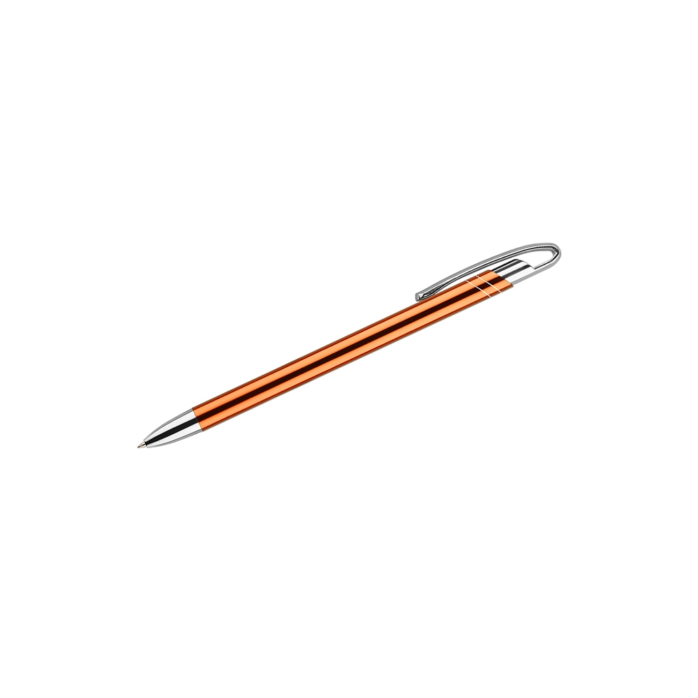 Dünner und schlanker Metallkugelschreiber in Farbe mit einem metallischen Finish. Clip und Spitzen in Silberchrom. AVALO zeichnet sich unter ähnlichen Kugelschreibern mit einem originellen Design des Clips aus. Der Körper ist mit zwei diagonalen Streifen in Silber verziert. Die Mine mit einer Dicke von 0,7 mm in blau.
