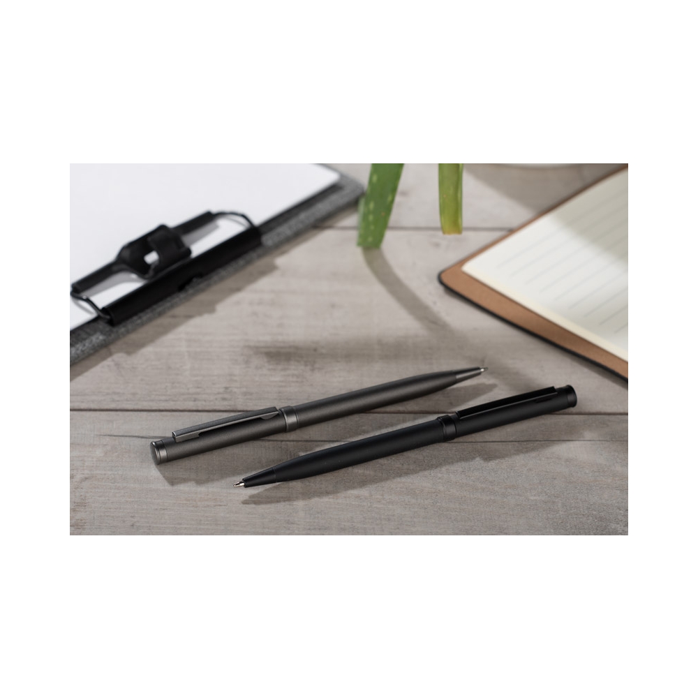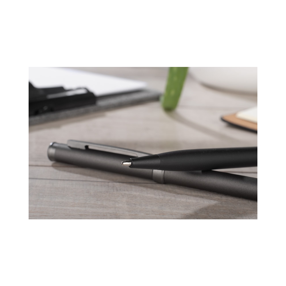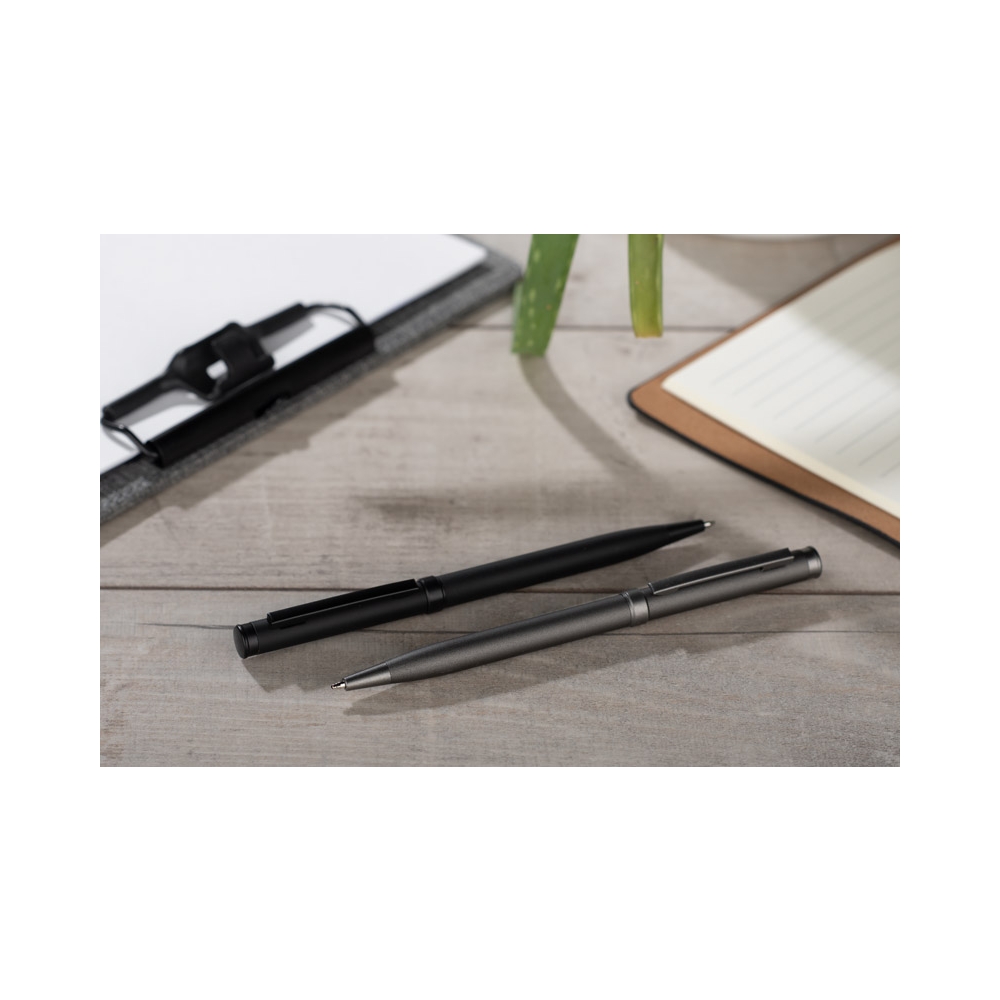 Ein Metallkugelschreiber und ein Rollerball-Stift sind in einer schönen Geschenkbox vereint. Dieses Set kann nach Ihren Wünschen gestaltet werden und ist somit ideal für die Werbung für Ihr Unternehmen.