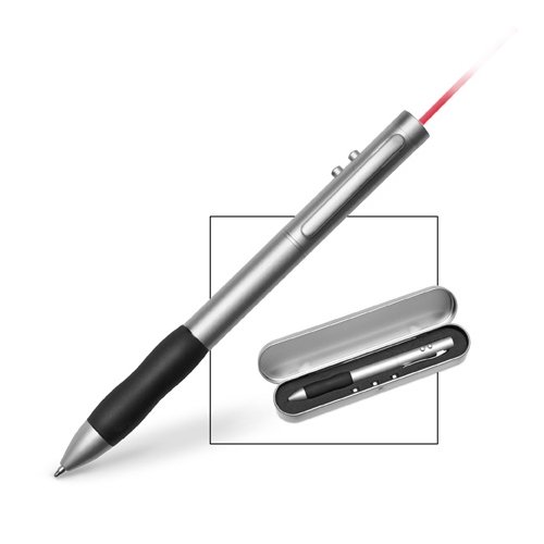 Die ergonomisch geformte Griffzone macht diesen Metallkugelschreiber mit integriertem Laserpointer, Touchpadstift und weißer LED zu einem Alleskönner mit Komfortqualität. In edler Geschenkbox aus Metall. Kunststoff/Metall, silber, Batterie inklusive, CE-Kennzeichnung, Eingabestift, Kugelschreibermine schwarz, LED-Farbe weiß, Geschenkverpackung Maße: 148 x 11 x 11 mm