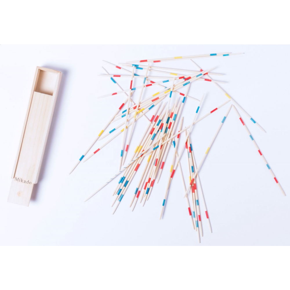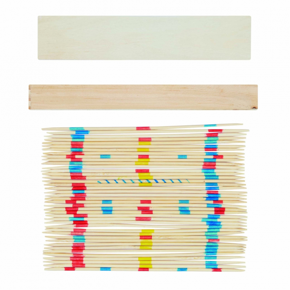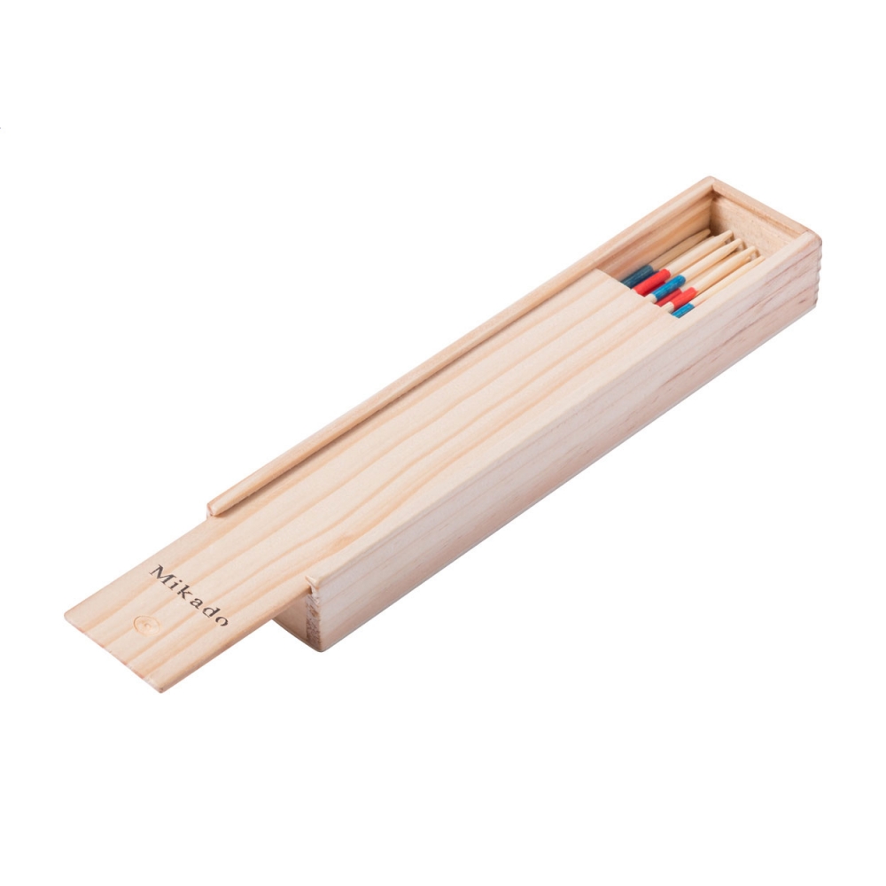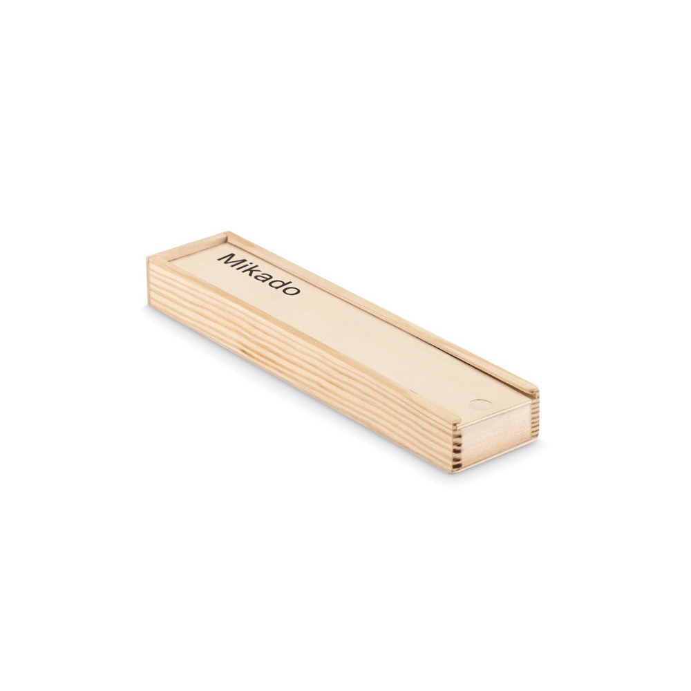 Mikado Spiel bestehend aus Holzstäbchen mit unterschiedlichen Farbkennungen in einer Holzbox verpackt. Trainieren Sie Ihre motorischen Fähigkeiten. Ihre Werbung wird auf die Box gedruckt.