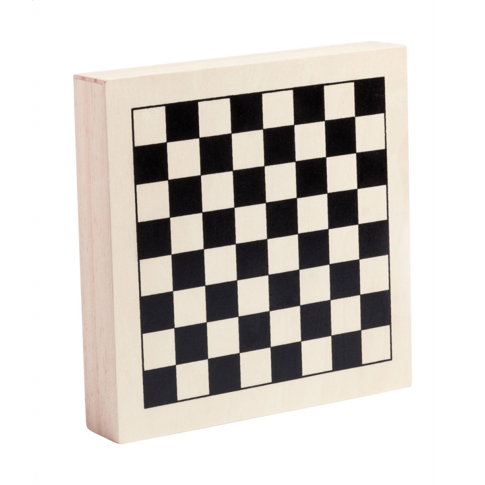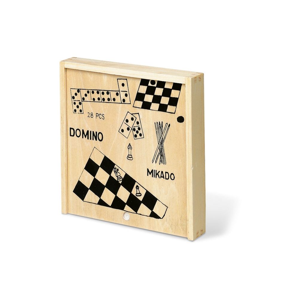 Set mit 4 Geschicklichkeitsspielen: Mikado, Schach, Dame und Domino. Präsentation in einer Box mit Doppelfunktions-Schiebedeckel als Schachbrettmuster auf der Innenseite.