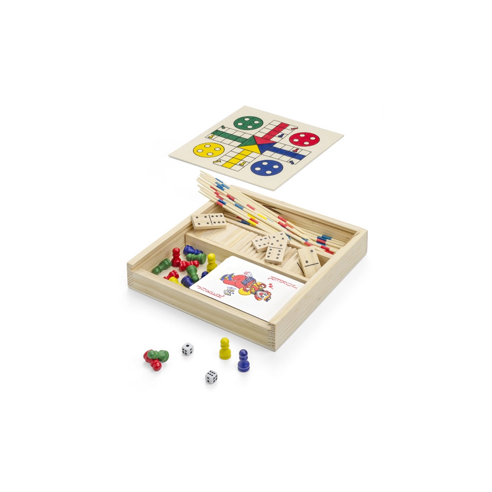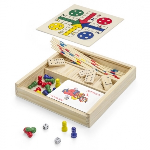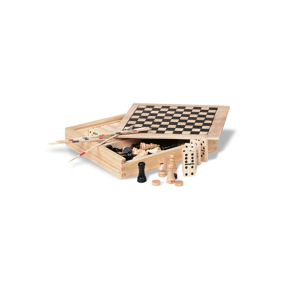 Backgammon, Schach, Dame, Domino, Ludo, Mikado und alle Arten von Kartenspielen in einer Holzbox. Zwei Seitendeckel mit schlichter Vorderseite für Werbeanbringung und Schachbrett auf der Rückseite. Zusätzliche Papiereinlage für Ludo und Backgammon. Anleitung inklusive. Achtung! Nicht für Kinder unter drei Jahren geeignet. Verschluckbare Kleinteile, Erstickungsgefahr.