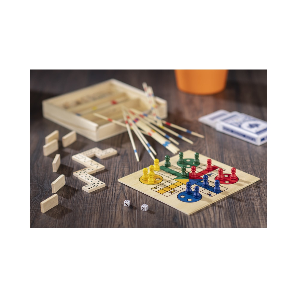 Die exklusive Holzkassette mit fünf Fächern enthält neun Spiele: Schach, Dame, Mühle, Backgammon, Ludo, Mikado, Domino, 3 x Spielkarten, verschiedene Würfel mit zwei Würfelbechern. Die zwei Spielbretter sind der Deckel für die Kassette. Achtung! Nicht geeignet für Kinder unter 36 Monaten.