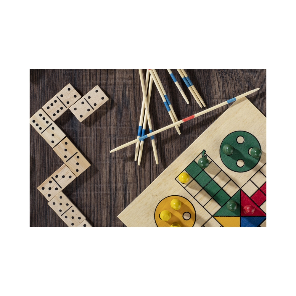 Spieleset aus Holz. Beinhaltet: Schach, Domino, Mikado und Dame.