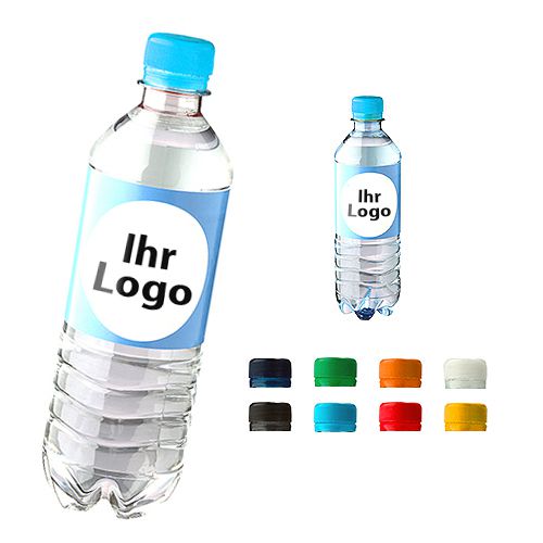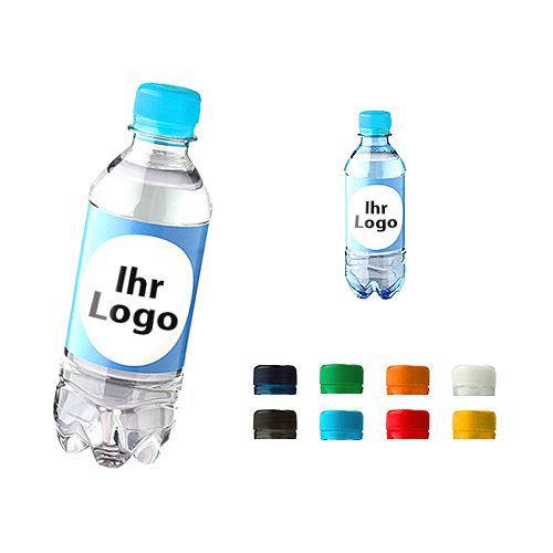 Die Flasche ist mit 8 verschiedenen Deckelfarben (weiß, gelb, orange, rot, grün, blau, dunkelblau, schwarz) und in zwei verschiedenen Tönungen (weiß-transparent, blau-transparent) für Sie produzierbar.
