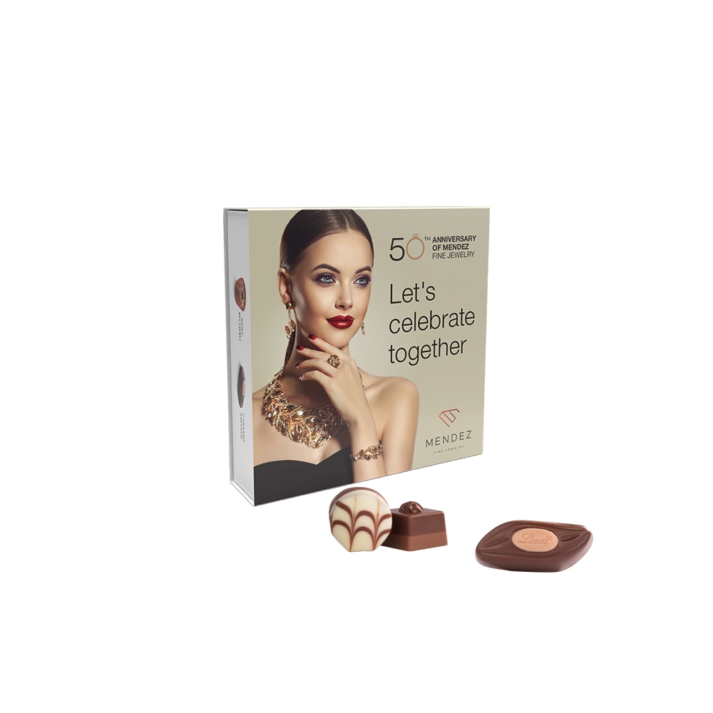 Lindt Mini Pralinés in Pralinenschachtel im Weihnachts-Werbeschuber mit einer Weihnachtsmütze zum Herausbrechen und Aufstellen, individuell bedruckt. Inhalt: 9 Lindt Mini Pralinés: Coeur a l'orange, Macchiato Stern, Caramel Amande, Vollmilch mit Krokant, Marc de Champagne Trüffel, 44 g