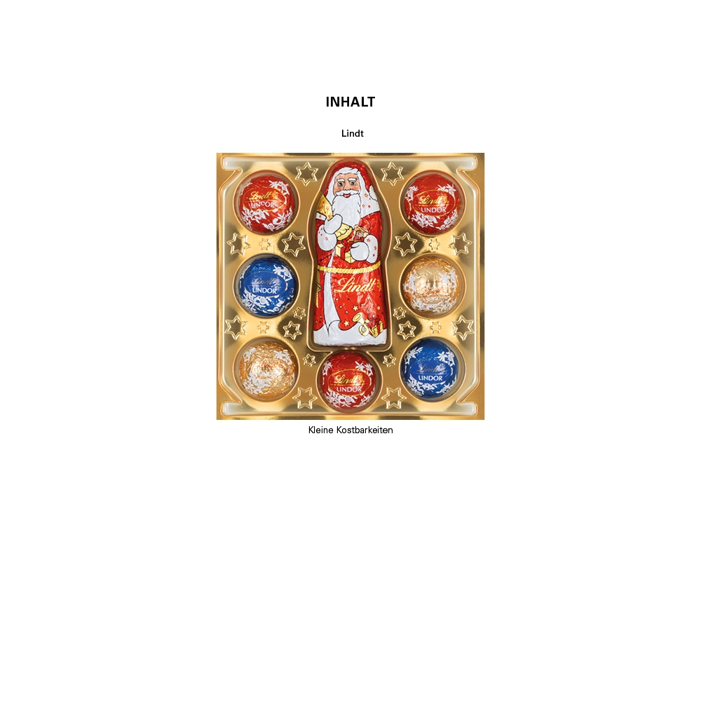 Maße: 10 x 10 x 2,2 cm Menge pro Karton: 72 Gewicht pro Karton: 5,3 kg Inhalt: Schokoladenmischung (40 g) 7 Stück Lindt "Minis" bunt gemischt und ein zartschmelzender Lindt Weihnachtsmann EAN / GTIN: 4067628905229