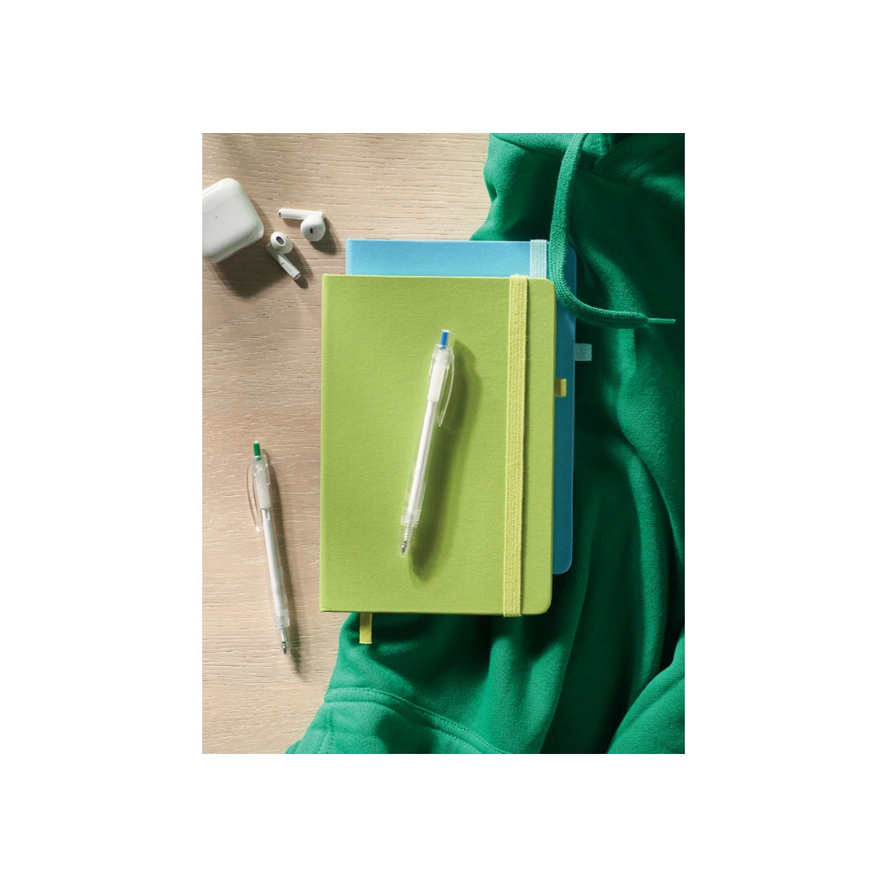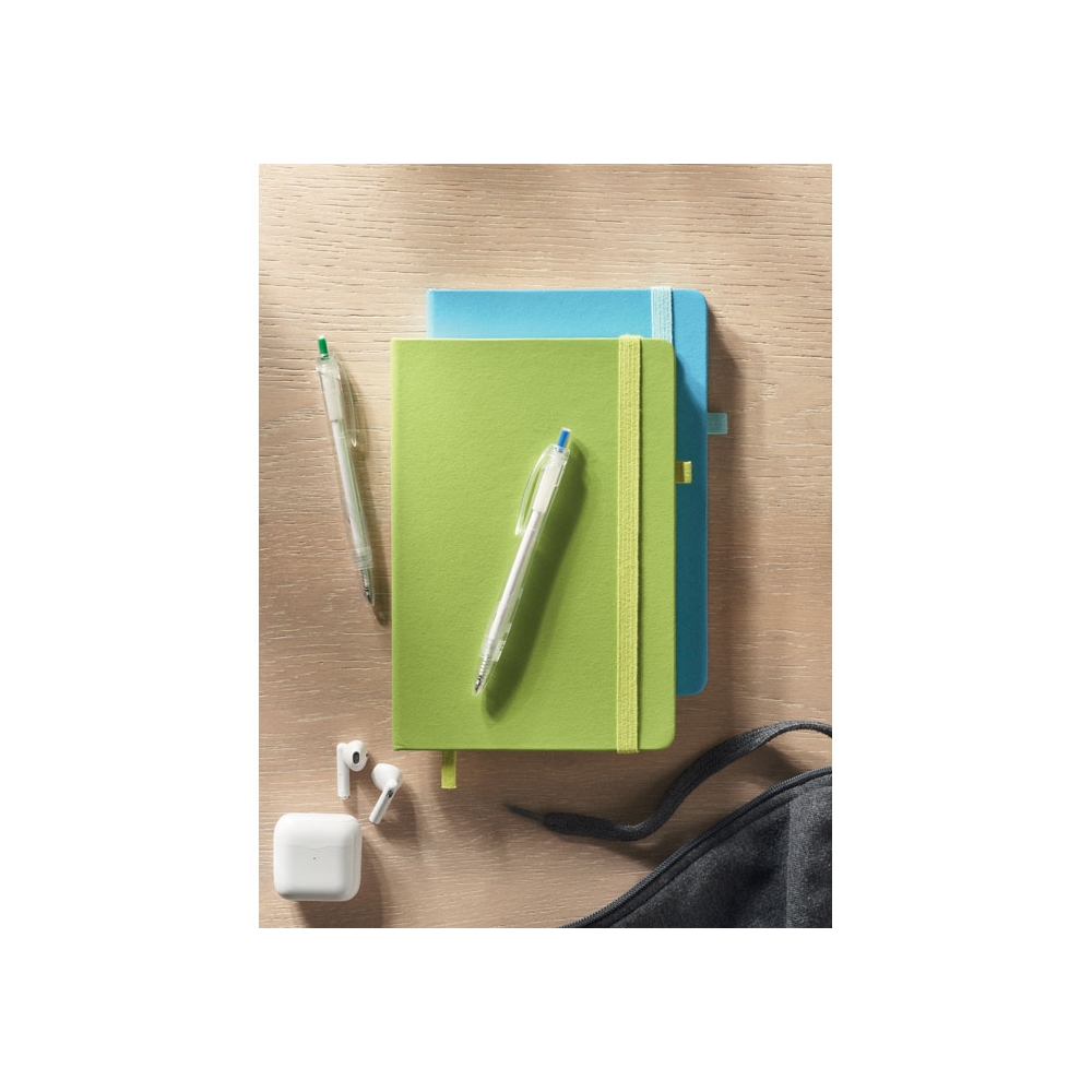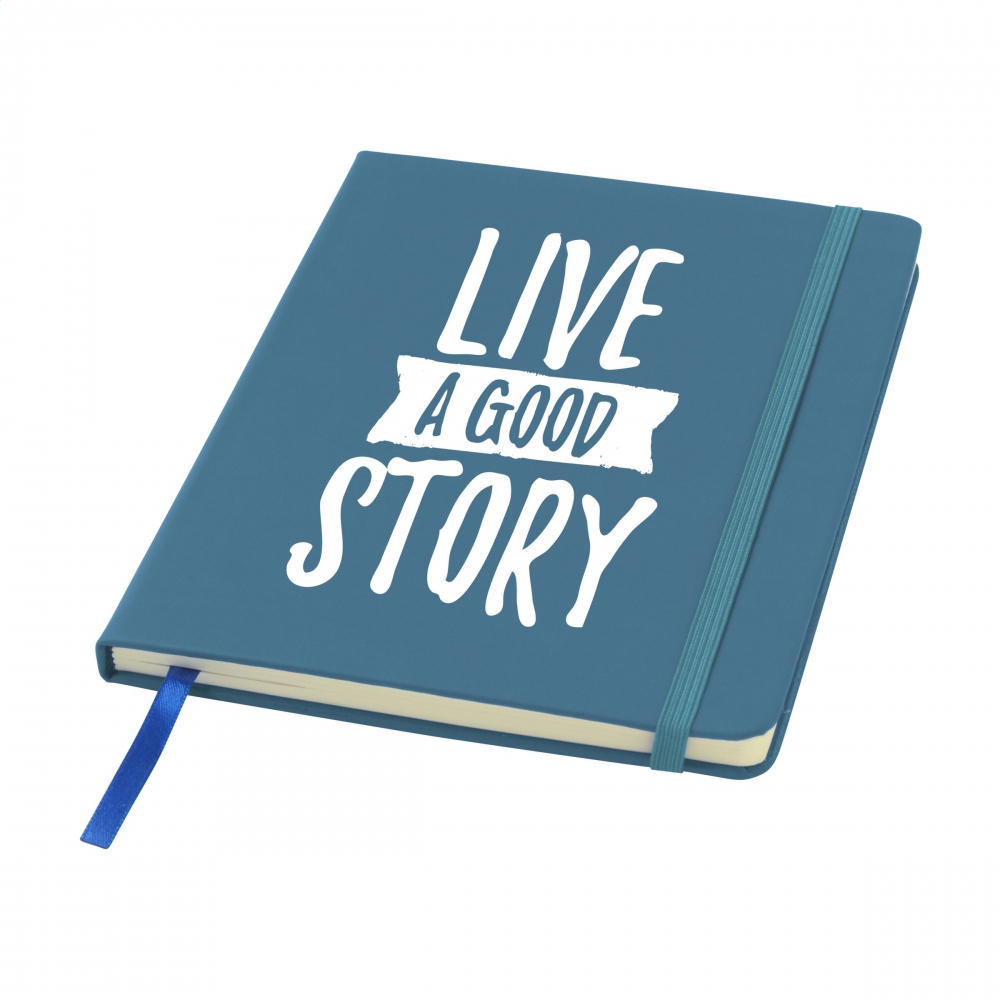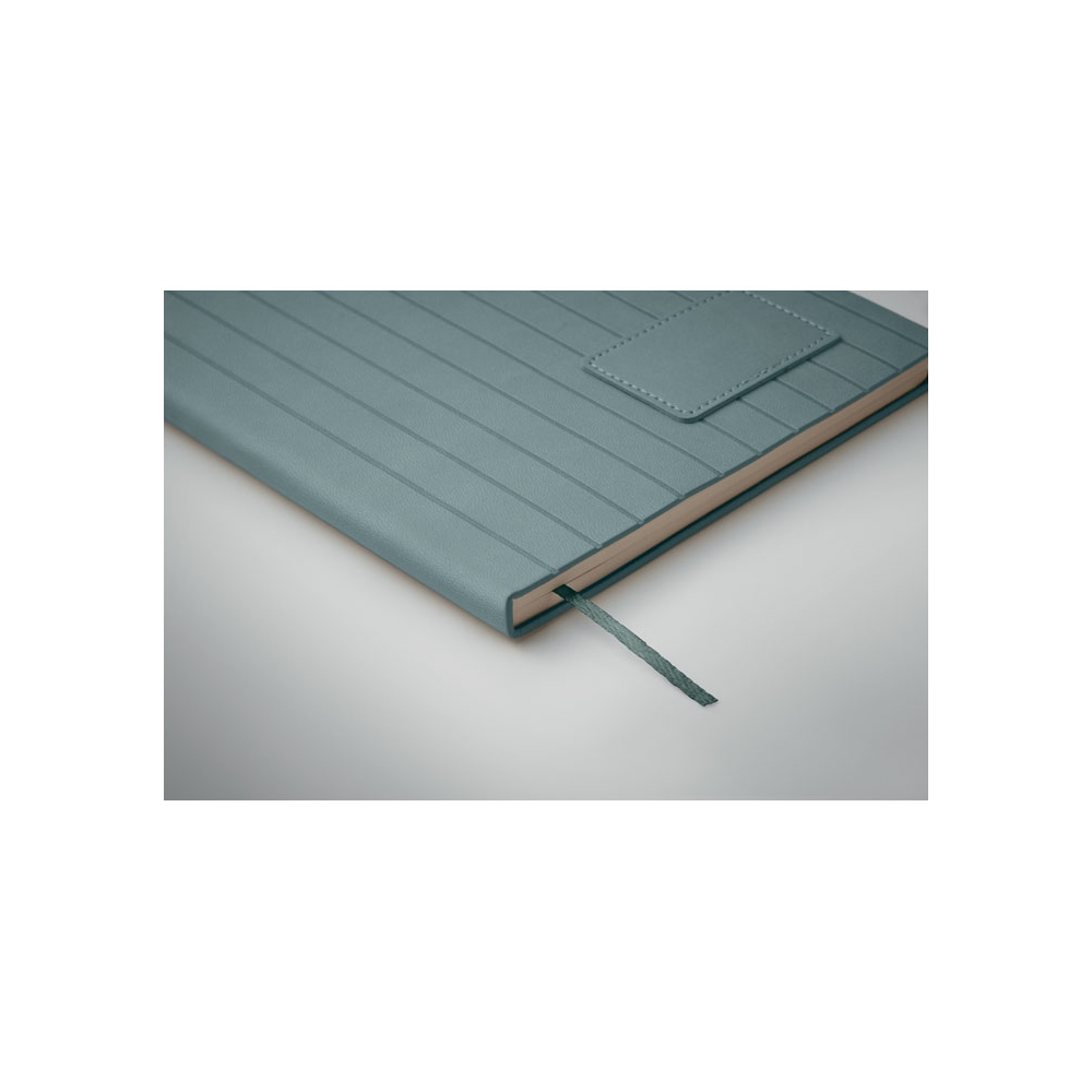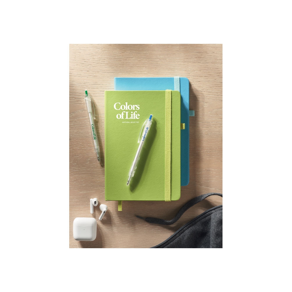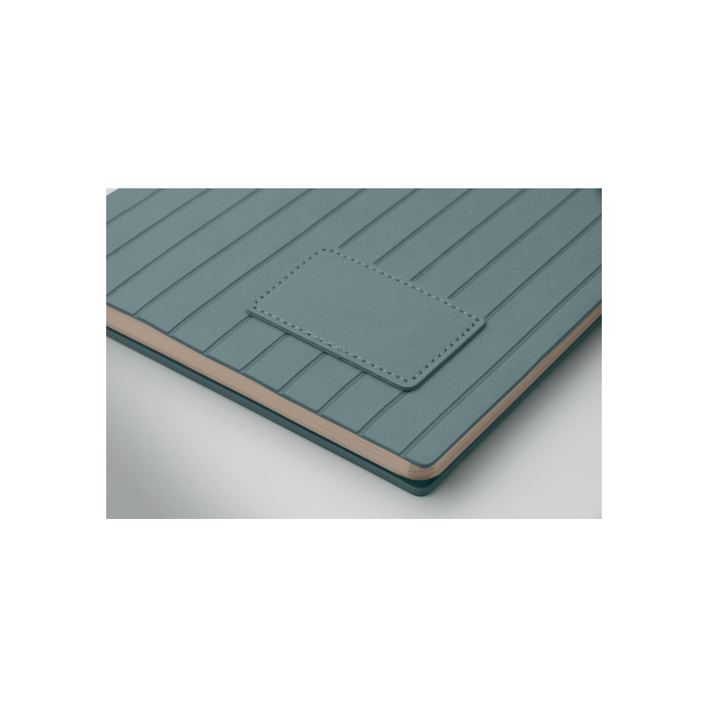 Artikel-Nr: AND800742-05Notizbuch mit recyceltem PU-Lederbezug und 100 linierten Blättern aus Recyclingpapier. Mit farblich passendem Lesezeichen und Gummiband. A6-Größe.