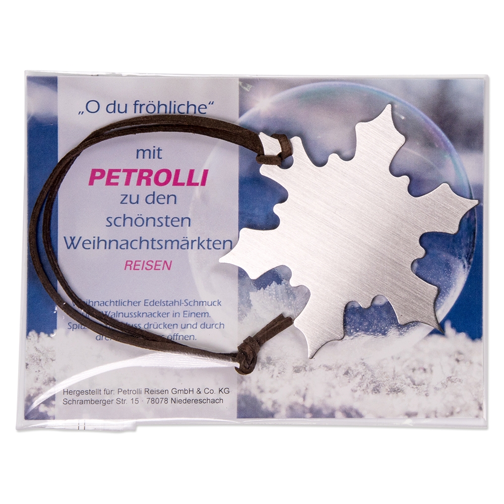 Artikel-Nr: 449006045Diese schöne Weihnachtskarte enthält ein nützliches Design-Objekt für den täglichen Gebrauch. In der Winter- und Weihnachtszeit kommt dieser Nussknacker aus Edelstahl (in Herzform) zum Einsatz. Die Karte enthält keine Nuss. Ein Kuvert ist separat erhältlich Art. 6103. Platz für den Werbedruck ist auf dem Standardmotiv der Karte oder eine eigene Gestaltung, jeweils ab 250 Stück.