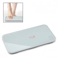 Digitale Personenwaage mit beleuchtetem Display und Wiegefläche aus gehärtetem Glas. Maximalgewicht: 180 kg, Interval 0,1 kg, Maßeinheit: kg / lb. Inkl. 2 AAA-Batterien.