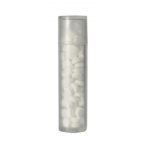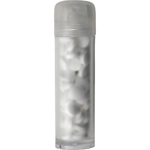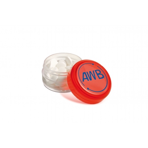 kleine runde Dose in matt weiß gefüllt mit ca. 20 g Tic-Tac Dragees mit Pfefferminz oder Orangengeschmack. inkl. Zutatenaufkleber und einzeln eingesleevt.