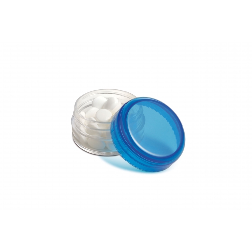 Farbe: blau Maße: 3,5 x 4,2 x 1,1 cm Material: Metalldose Füllmenge: 9 g Pfefferminz