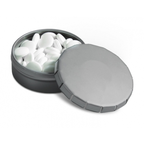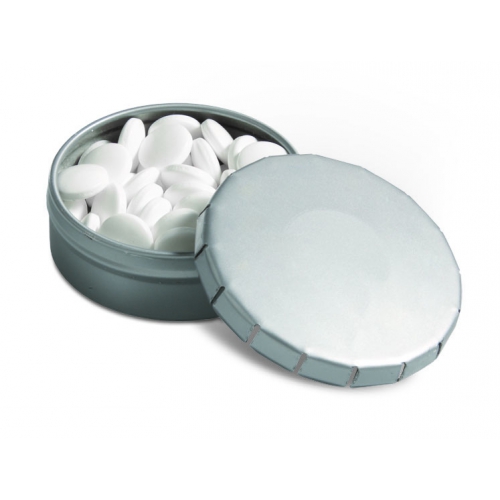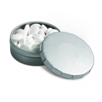 Schiebedeckeldose mit ca. 10 g Pfefferminz - mit silbernem Deckel und silbernem Unterteil. Format: 5,5 x 4,5 x 1 cm, Haltbarkeit: 24 Monate, Lieferzeit: ca. 2 Wochen, Preise inkl. 3-farbigen Druck, zzgl. Drucknebenkosten
