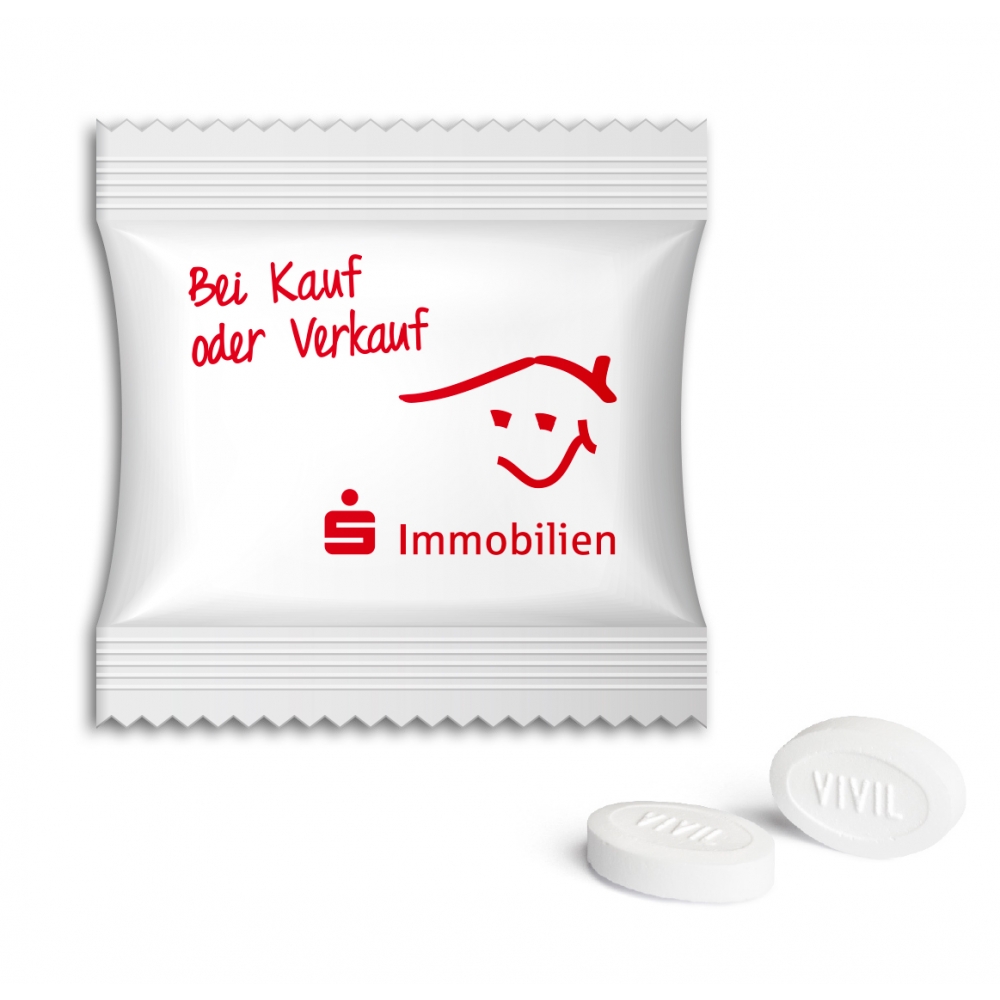 2 zuckerfreie Vivil Friendship Pfefferminz verpackt im individuell bedruckten Werbetütchen.