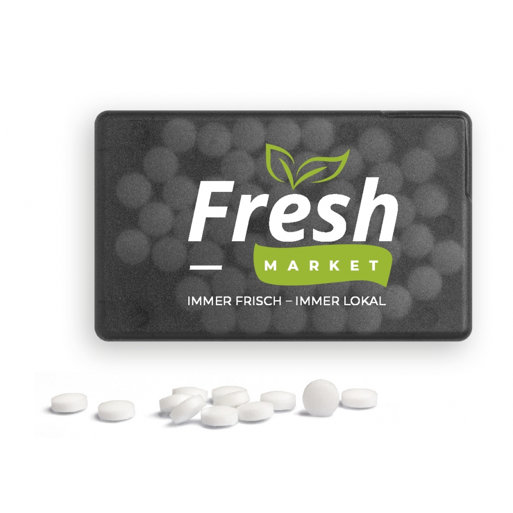 Artikel-Nr: FNM02002Standbeutel Mini schwarz. Werbeanbringung als Etikett in 4c individuell bedruckbar. Zutaten Bio Grüner Tee mit Minze: Grüner Tee (Sencha)*, Pfefferminze*. *aus kontrolliert biologischem Anbau.