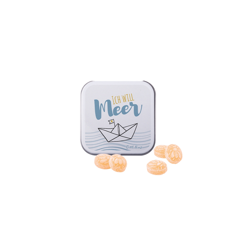 Quadratische weiße Metalldose mit Scharnierdeckel, Weißblech 98% recycelbar, individuell bedruckt. Inhalt: Cavendish & Harvey Honigbienen-Bonbons mit deutschem Qualitätshonig von nearBees, 18 g
