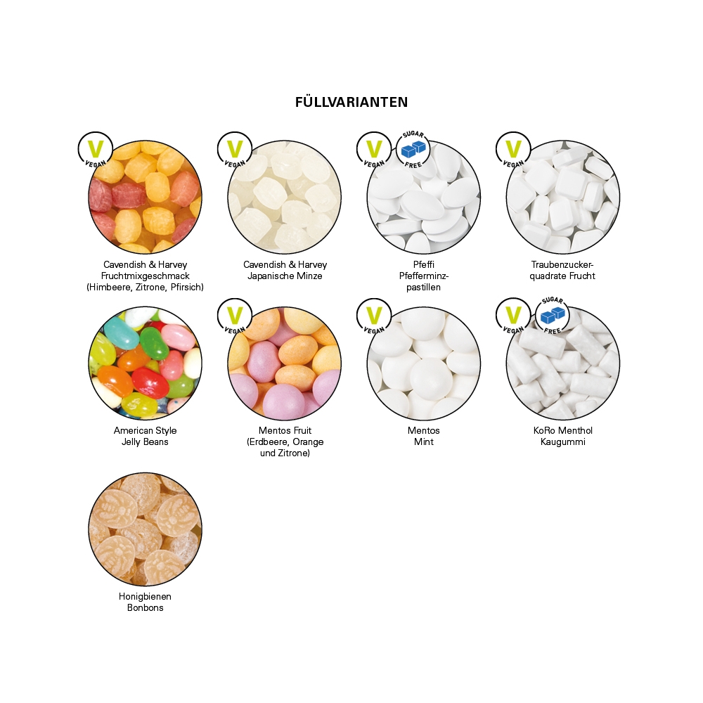 Ausführung: Material: Dose, Füllung: Cavendish & Harvey Honigbienen-Bonbons Maße: 5,5 x 5,5 x 1,8 cm Menge pro Karton: 600 Zolltarifnummer: 1704 9071 Füllvarianten: Pfeffi Pfefferminzpastillen, zuckerfrei oder Cavendish & Harvey Mini Bonbons Japanisch Minze oder Traubenzuckerquadrate oder Mentos Kaudragee Fruit oder Mentos Kaudragee Mint oder American Style Jelly Beans oder KoRo zuckerfreie Menthol Kaugummis ode ... Nettog ...