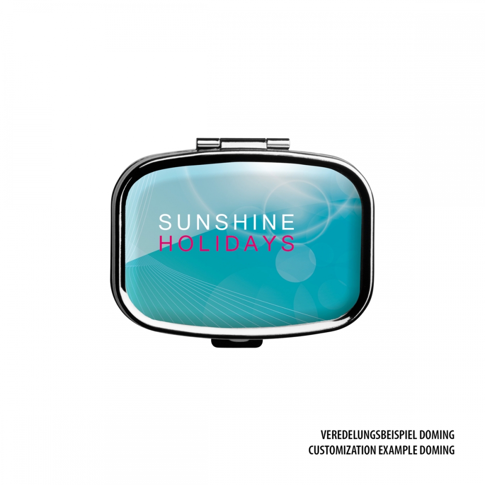 Klein, handlich und praktisch, das ist, was die Pillendose RE98-POSADAS auszeichnet. Die kleine Dose aus glänzendem Metall enthält zwei Fächer für Tabletten. Der Deckel des Kästchens kann mit einer Lasergravur oder einem brillanten, vollflächigen Doming veredelt werden.