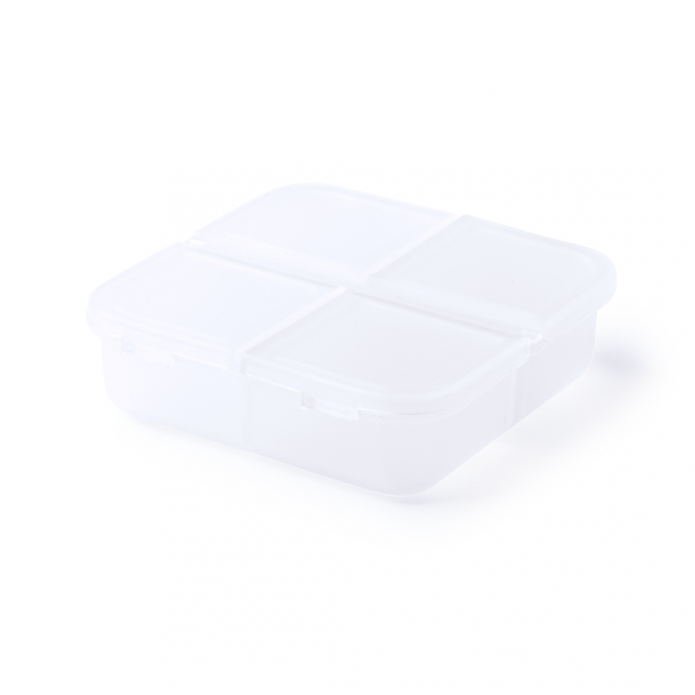 Pillenbehälter mit 4 Innenfächern, Sicherheitsverschluss mit Silikonrändern und Klinge zum Teilen von Pillen. Hergestellt mit einer transparenten Oberfläche.