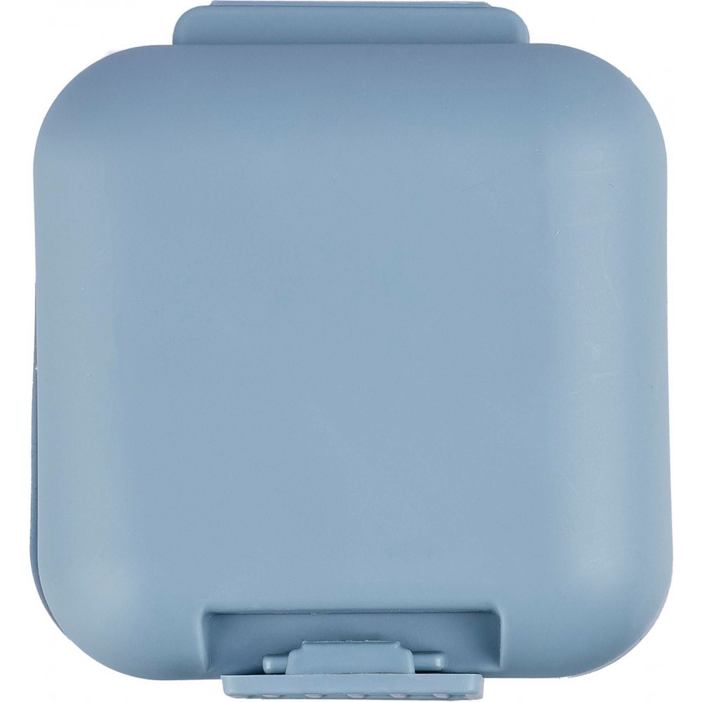 Pillendose mit einem Aufbewahrungsfach und einem Schneider. Die zwei farblichen Innendosen lassen sich leicht unterscheiden und entnehmen. 94 x 48 x 16 mm
