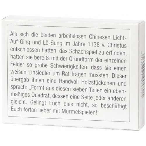 Die Chinesen Licht-Auf-Ging und L-Sung wollten das Schachspiel erfinden. Das misslang. So erfanden sie ein siebenteiliges Quadrat zum Zusammenbauen. Achtung! Nicht geeignet für Kinder unter 36 Monaten.
