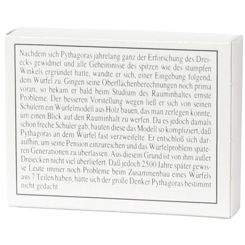 Pythagoras widmete sich dem Würfel, bekam das verflixte Ding aus sieben Teilen aber nicht zusammen, um es zu berechnen. Helfen Sie ihm! Auch in englischer Version erhältlich: Art.-Nr. 102526. Achtung! Nicht geeignet für Kinder unter 36 Monaten.