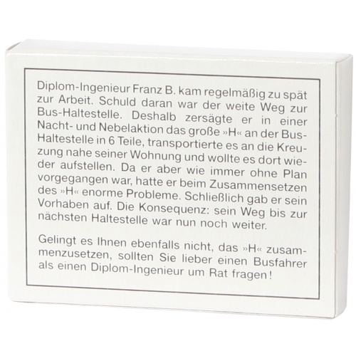 Kniffliges 3-D-Puzzle in exklusivem Design! Das Puzzle besteht aus 32 beweglichen Teilen. Diese kann man in alle Richtungen hin und her bewegen. Ziel des Geduldspieles ist es, die Teile in eine bestimmt Position zu bringen, verschiedene Aufgaben zu lösen, eigene Tricks auszuprobieren ... Ihrer Phantasie sind keine Grenzen gesetzt! Achtung! Nicht geeignet für Kinder unter 36 Monaten.