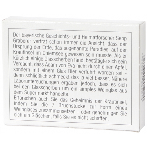 Der Heimatforscher Sepp Graberer fand auf der Krautinsel im Chiemsee, seinen Forschungsergebnissen nach, das ehemalige Paradies, ein zerbrochenes Weinglas. Sind Adam und Eva nicht vom Apfel, sondern vom Wein verführt worden? Sieben Teile. Auch in englischer Version erhältlich: Art.-Nr. 102543. Achtung! Nicht geeignet für Kinder unter 36 Monaten.