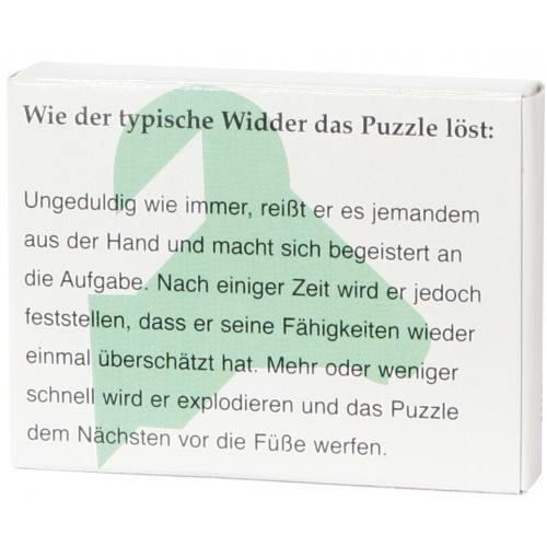 Verzwicktes Holz-Legepuzzle für Ihr Sternzeichen - auf der Schachtelrückseite ist lustig beschrieben, wie jeder Sternzeichen-Typ seine Aufgabe lösen wird! Sieben Teile! Achtung! Nicht geeignet für Kinder unter 36 Monaten.
