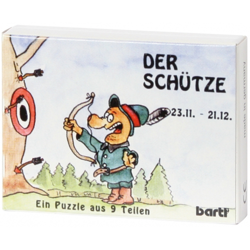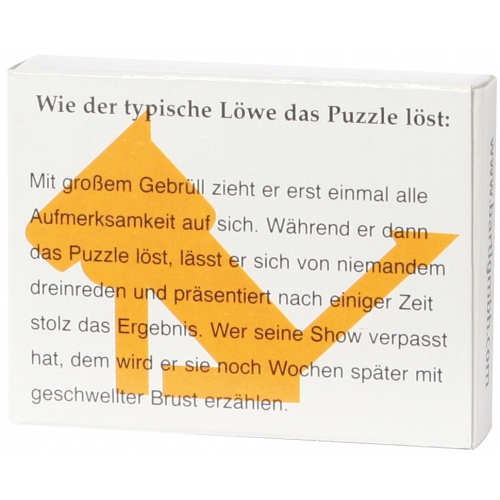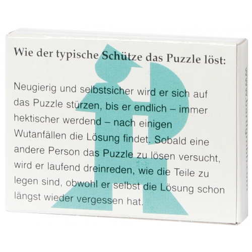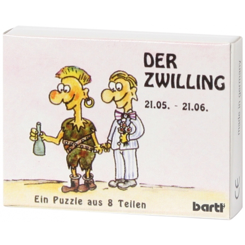 Verzwicktes Holz-Legepuzzle für Ihr Sternzeichen - auf der Schachtelrückseite ist lustig beschrieben, wie jeder Sternzeichen-Typ seine Aufgabe lösen wird! Neun Teile! Achtung! Nicht geeignet für Kinder unter 36 Monaten.