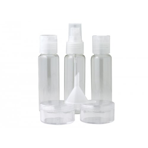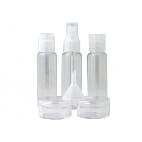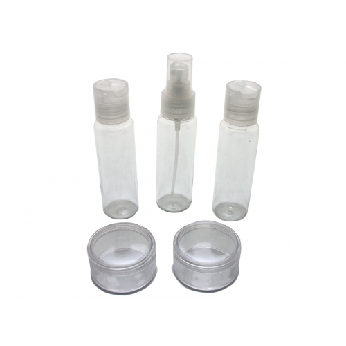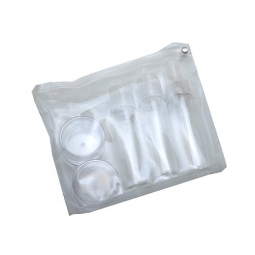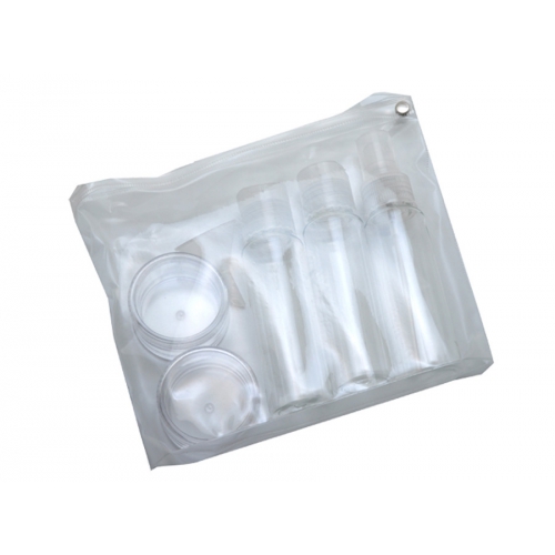 Artikel-Nr: KTO161040010005-teiliges Reiseset mit transparentem Design. Enthält zwei Flaschen für Gel und Shampoo mit Schraubverschluss, Zerstäuber, zwei Töpfe für Creme. Präsentiert in einer PVC-Tasche mit Ziplock-Verschluss.