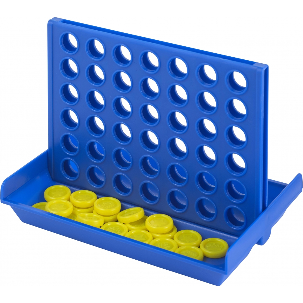 Reisespiel - 4 in einer Reihe (faltbar) aus Kunststoff. Mit 21 gelben und 21 roten Chips. Gefaltete Größe: 13 x 9 x 2,5 cm. Das Spiel wird in einer weißen Tasche aus Nonwoven geliefert, welche mit einer Kordel verschlossen ist.
