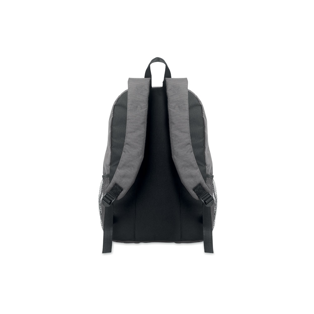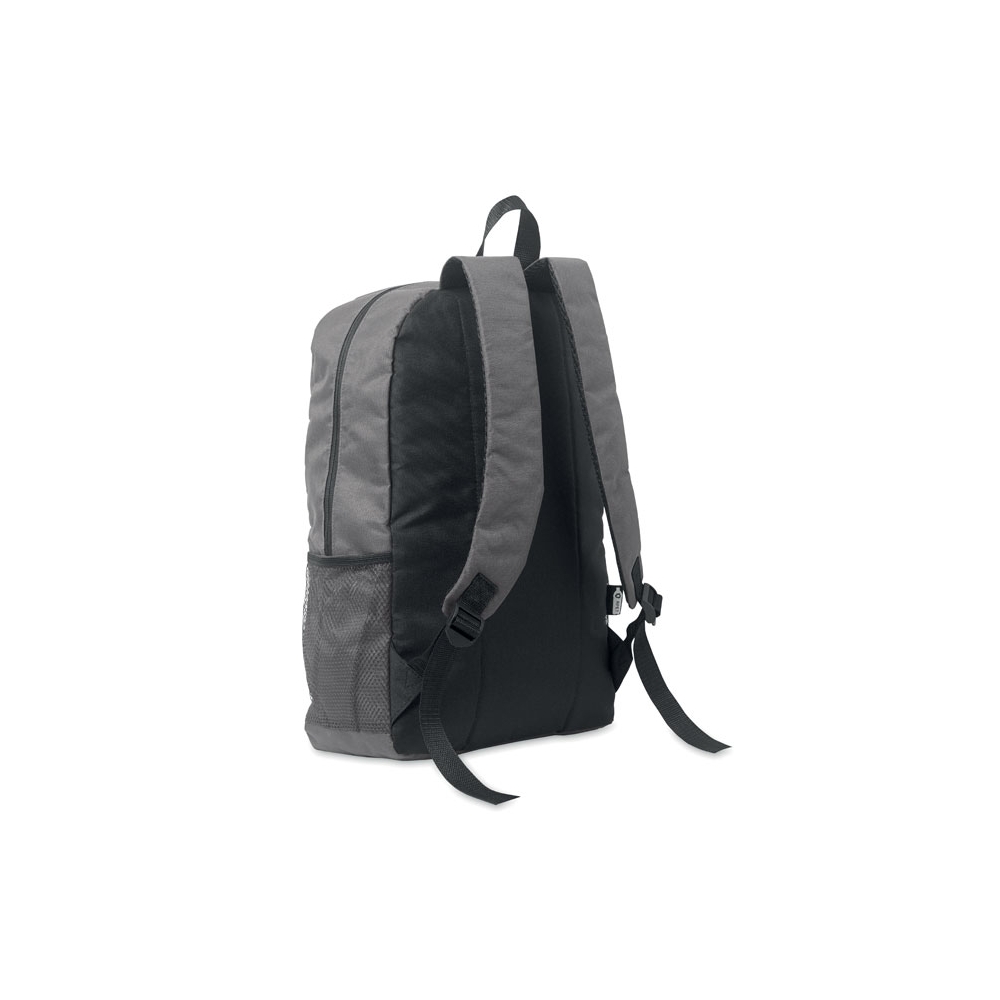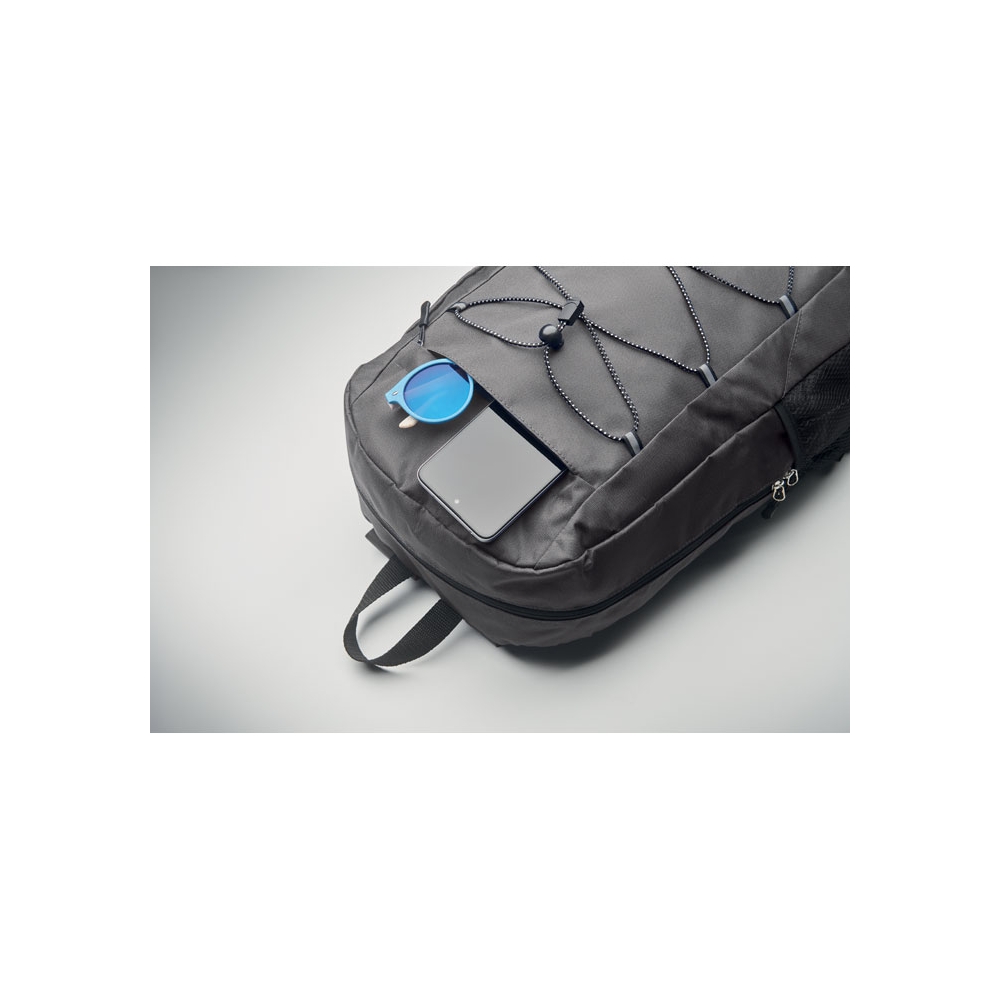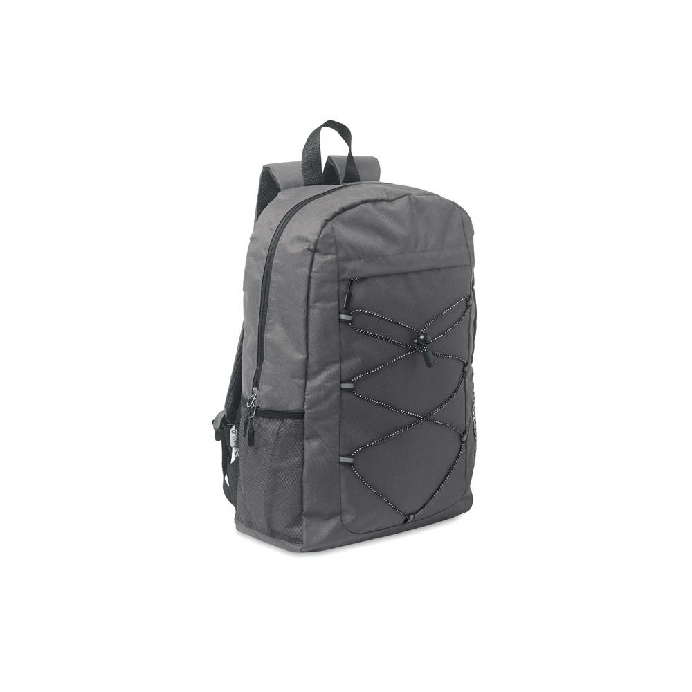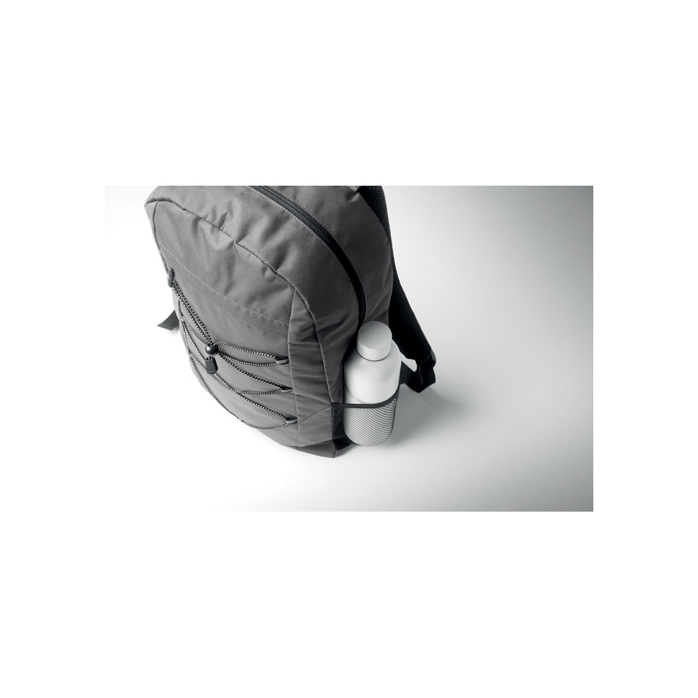 Artikel-Nr: OCBMO2491-15Rucksack mit Schnürung. Fronttasche mit Reißverschluss. Netztaschen auf beiden Seiten. 600D RPET-Polyester.