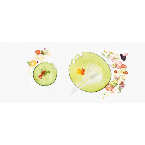 Von der Natur inspirierte, visuelle Frische auf den Tisch: Die SHADOW Schale erinnert an das riesengroße Blatt einer tropischen Dschungelpflanze. Ihr formales Thema ergänzt sich demnach wundervoll mit all den bunten Früchten, Salaten oder Gemüsen, die in ihr serviert werden. Die Aussparungen und Öffnungen am Rand nehmen die Stiele von Salatbestecken und Vorlegelöffeln auf – in der lebendigen Form der SHADOW Salatschale steckt also auch eine gesunde Portion Funktion!