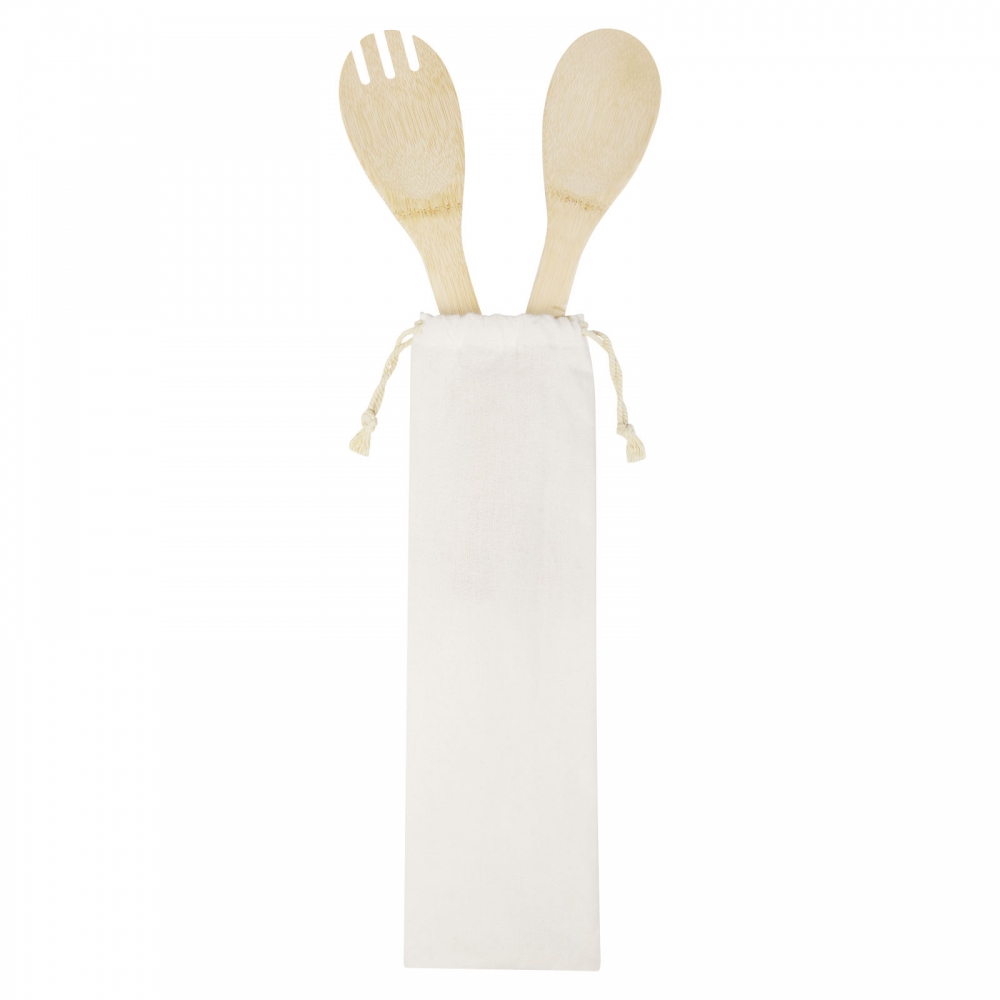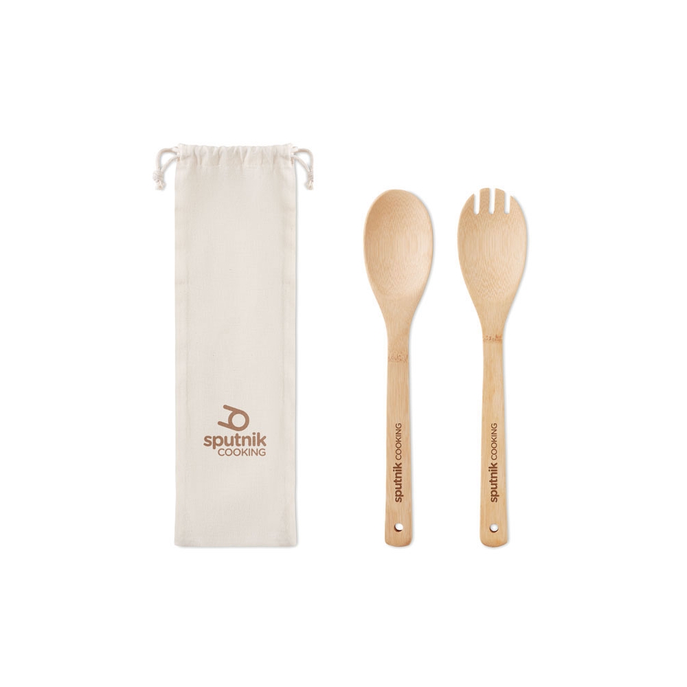 Salatlöffel- und Gabelset aus Bambus, praktisch für tägliche Mahlzeiten mit der Familie. Der verwendete Bambus wird nach nachhaltigen Normen beschafft und produziert.