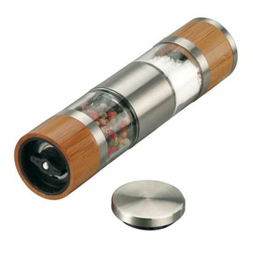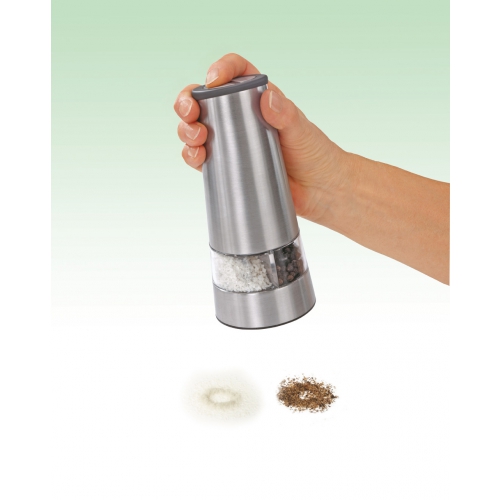 Genießen Sie das Aroma von frisch gemahlenen Pfefferkörnern und Salz! Hochwertiges Set aus mechanischer Salz- und Pfeffermühle mit Edelstahlmahlwerk in einem zeitlos eleganten Aluminiumgehäuse. Meersalz und Pfefferkörner werden einfach per Daumendruck zuverlässig gemahlen - ganz ohne Batterien. Im eingelassenen Acrylfenster sehen Sie sofort, wenn die Edelstahlmühlen nachgefüllt werden müssen. Hochwertige Karton-Geschenkverpackung inkl.