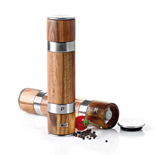 Einfaches Nachfüllen durch Abziehen des Oberteils. Rost- und verschleißfreies Hochleistungs-Ceramic Mahlwerk mit Stufenlose Feineinstellung von fein bis grob. Material: Akazienholz Höhe: 14 cm, Durchmesser: 5 cm