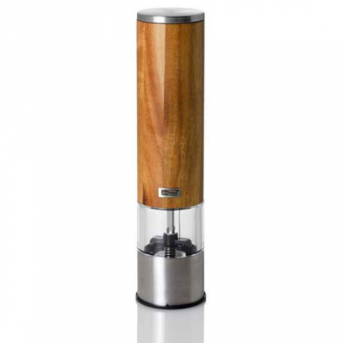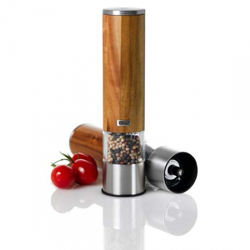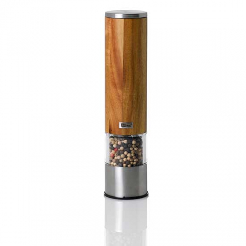 Rost- und verschleißfreies Hochleistungs-Ceramic Mahlwerk mit LED Licht für optimale Ausleuchtung und stufenlose Feineinstellung von fein bis grob. Durch den Mahlwerkverschluss kommt kein Mahlgut auf die Abstellfläche. Material: Edelstahl/Akazienholz Höhe: 22 cm, Durchmesser: 5,2 cm