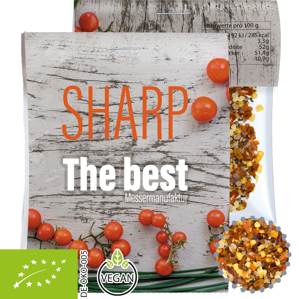 Midi-Tüte aus transparenter Folie. Werbeanbringung als Werbereiter in 4c individuell bedruckbar. Zutaten Bio Gewürzmischung Feuer und Flamme: Steinsalz, Chili*, Pfeffer*, Paprika*, Knoblauch*; *aus kontrolliert biologischem Anbau.
