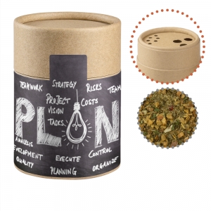 Kraftpapierdose Mini aus Papier. Werbeanbringung als Etikett in 4c individuell bedruckbar. Zutaten Bio Gewürzmischung Alleskönner: Steinsalz, Tomaten*, Zitronenschale*, Pfeffer*, Zwiebeln*, Paprika*, Knoblauch*, Thymian*, Rosmarin*, Basilikum*, Lavendel*; *aus kontrolliert biologischem Anbau.