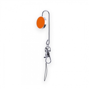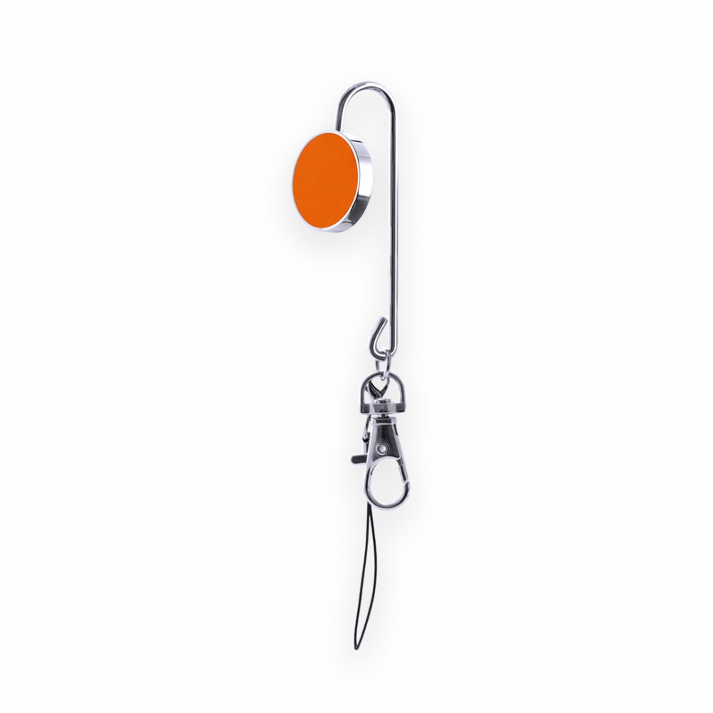 Schlüsselanhänger mit Handtaschenhalter aus Metall. Haken mit Kunstlederbesatz in kräftigen Farben sowie Trageschlaufe mit Karabinerverschluss. Präsentiert in einer individuellen Hülle.