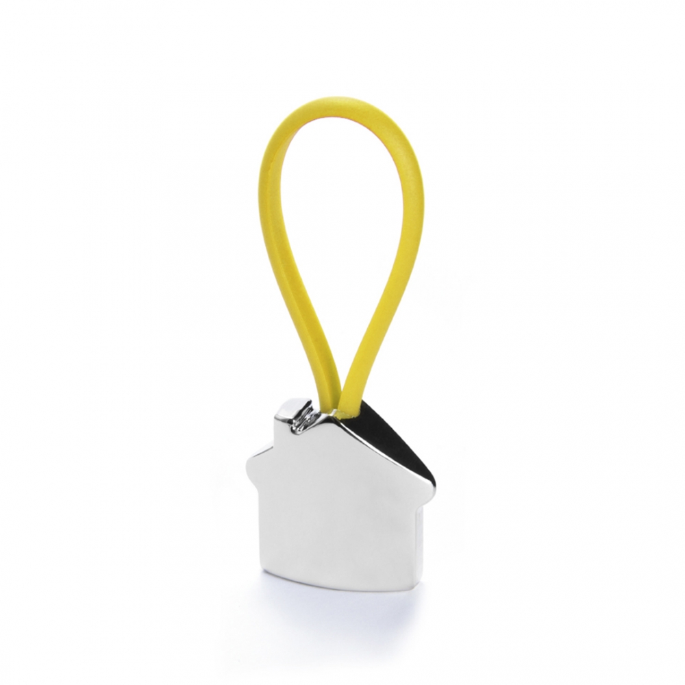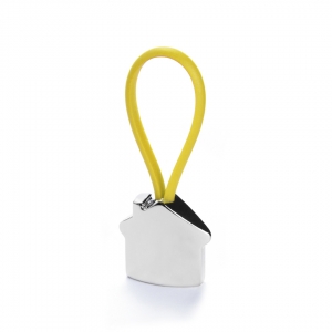 Metall-Schlüsselanhänger mit elegantem Haus-Design in 3D. Mit Gummiband in verschiedenen lebendigen Farben für die Befestigung der Schlüssel.