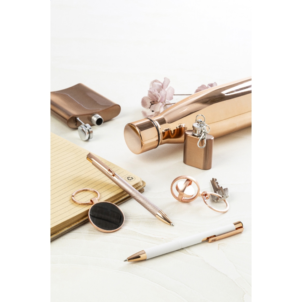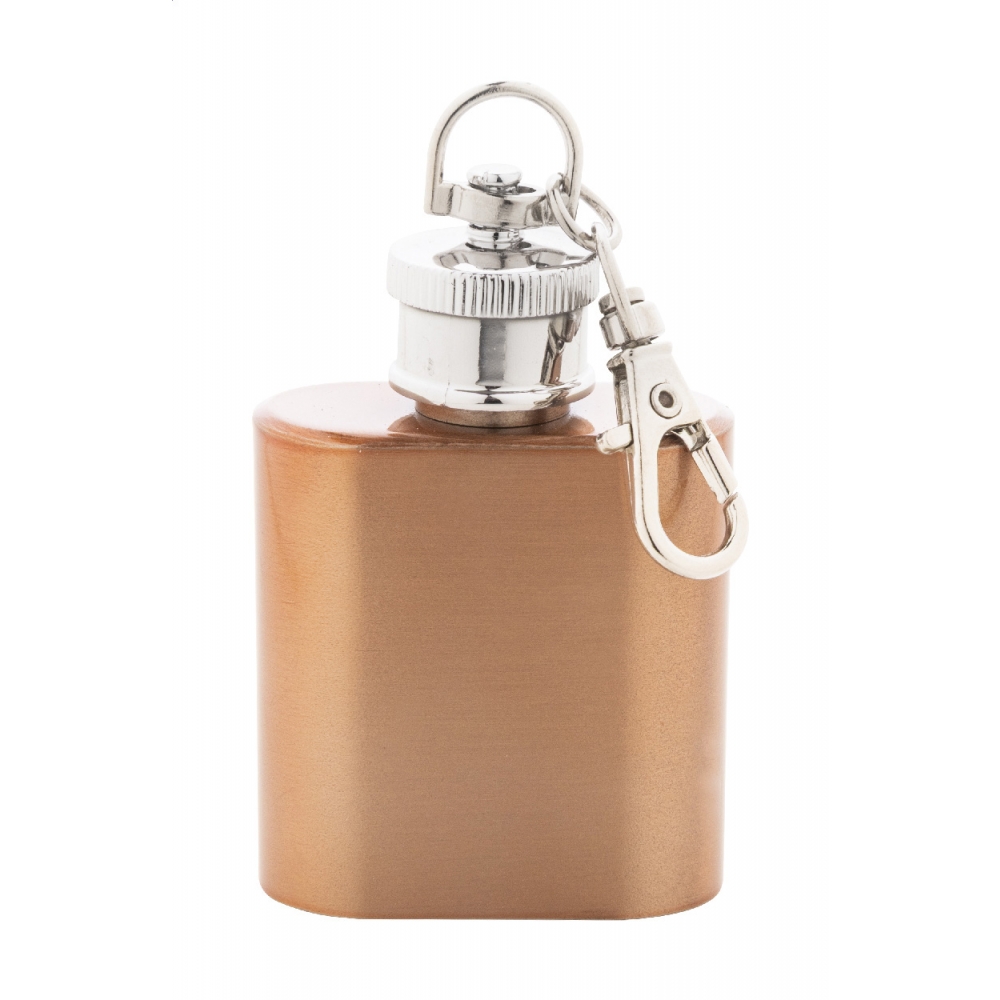 Mini-Flachmann aus recyceltem Edelstahl mit glänzendem Metallic-Oberfläche und Karabiner-Schlüsselring. Füllmenge: 30 ml.
