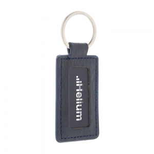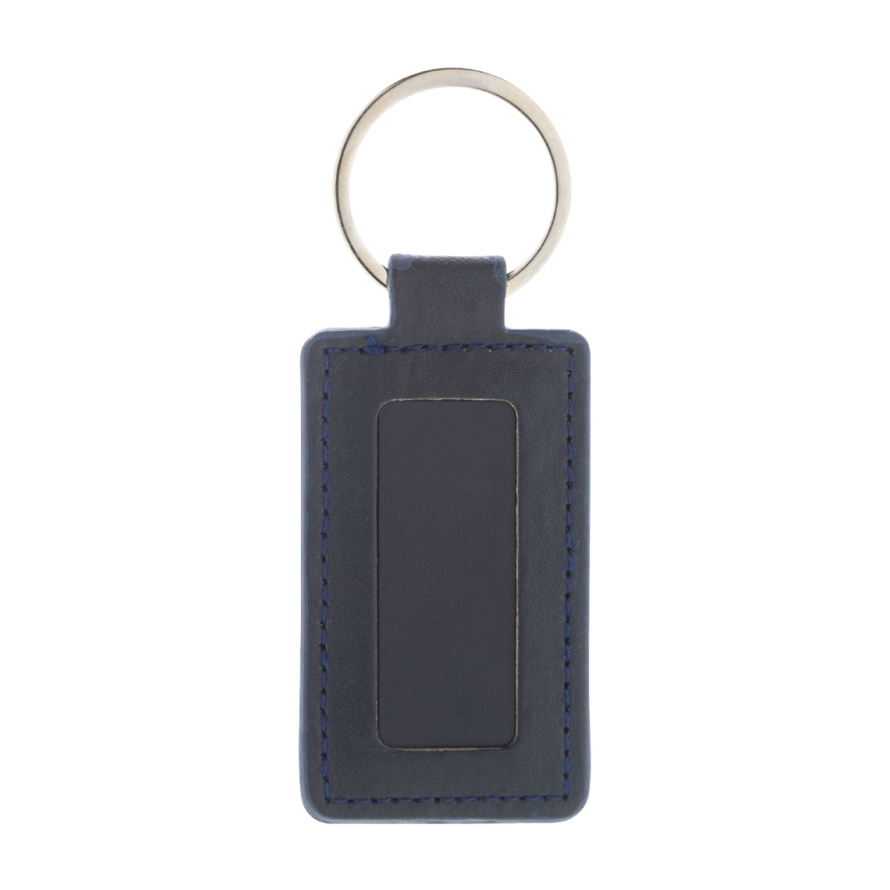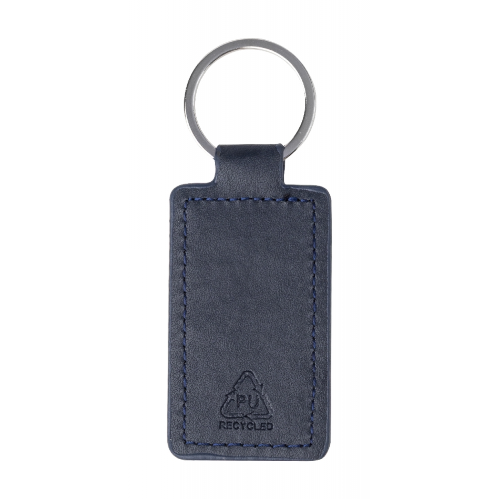 Rechteckiger Schlüsselanhänger aus recyceltem PU-Leder mit Metallring und Logoplatte aus Edelstahl mit gummierter Oberfläche. Mit Spezialbeschichtung für Spiegelgravur.