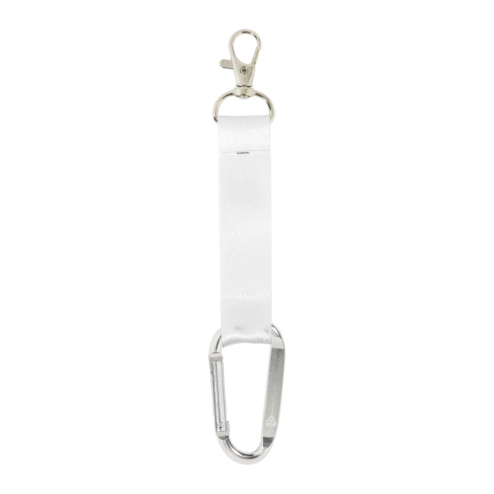 Individueller Mini-Schlüsselanhänger aus RPET-Polyester inkl. beidseitigem Sublimationsdruck. Mit kleinem Metallkarabiner und großem Karabinerhaken aus recyceltem Aluminium. Mindestmenge: 100 Stk.