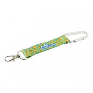 Schlüsselanhänger mit fröhlichem Design und Polyesterband in verschiedenen kräftigen Farben. Mit Metallkörper mit Stanzung - speziell entworfen für die Personalisierung mittels Doming / 3D Gel-Aufklebern.