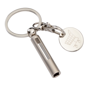Schlüsselanhänger mit einem durch einen Karabinerhaken abnehmbaren Einkaufschip. Ihre Werbung lasern wir auf die silberne Seite des Chips.